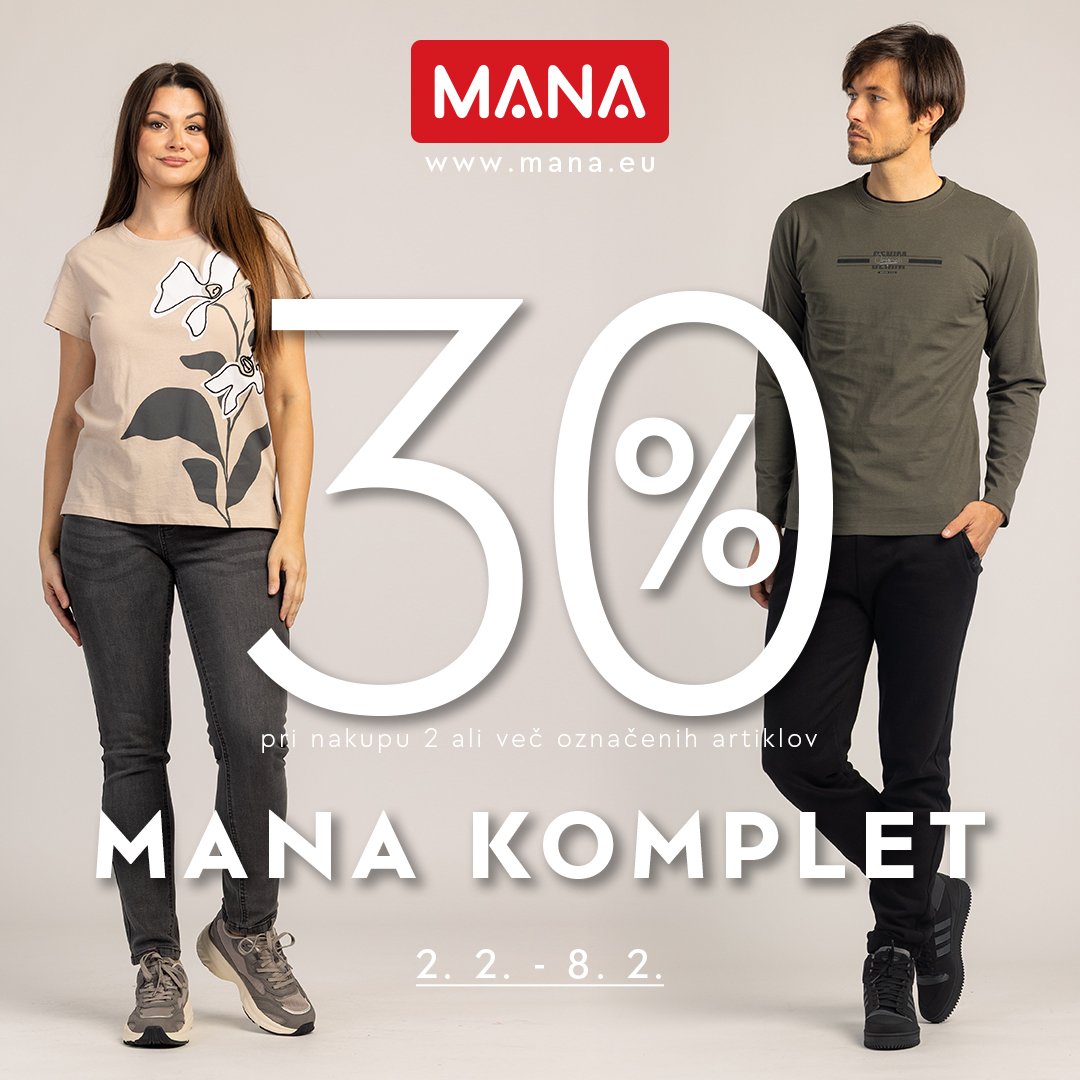Ustvari svoj MANA komplet! V trgovinah MANA izkoristi posebno akcijo, ki ti omogoča 30% popust pri nakupu dveh moških ali ženskih oblačil. Kombinira…